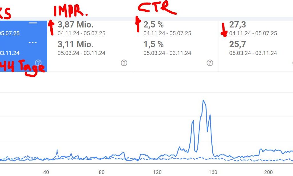 Die CTR ist das Verhältnis von Klicks zu Impressionen. Sie misst, wie oft Nutzer auf dein Suchergebnis klicken, wenn es ihnen angezeigt wird. Eine Steigerung der CTR von 1,5% auf 2,5% ist phänomenal und erklärt den massiven Klickzuwachs vollständig.