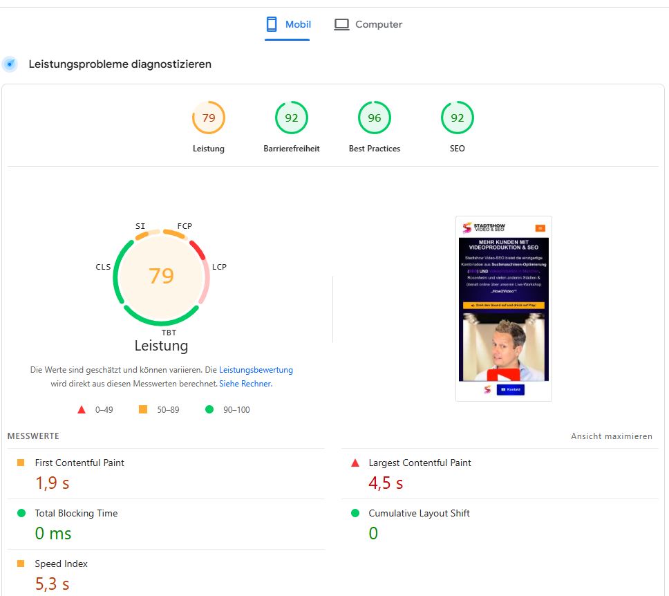 Wir haben alle keine Geduld. Wenn deine Seite länger als 3 Sekunden lädt, bin ich weg. Und Google sieht das genauso. Seit einiger Zeit nutzt Google echte Chrome-Nutzerdaten, um deine Ladegeschwindigkeit zu bewerten. Das sind die sogenannten Core Web Vitals. Du kannst deine Webseite kostenlos bei Google PageSpeed Insights testen. Das sieht dann ungefähr so aus wie bei mir oder idealerweise wesentlich besser: